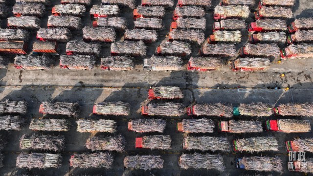 △来宾东糖凤凰有限公司内的甘蔗原料停放区。(总台央视记者范凯拍摄)