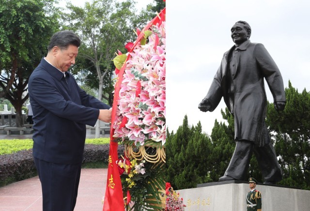 2020年10月14日,深圳经济特区建立40周年庆祝大会在广东省深圳市隆重举行,习近平在会上发表重要讲话。这是当天下午,习近平来到莲花山公园,向邓小平同志铜像敬献花篮。