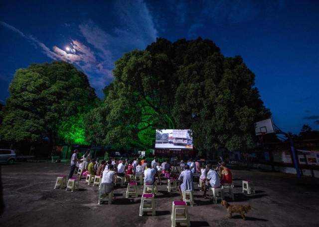 村民在菜花坪镇菜塘村弄堂文化广场观看电影。(谭德乐 摄)