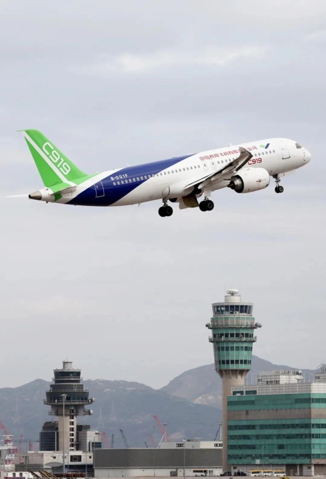 △2023年12月16日,一架蓝绿涂装的C919大型客机从香港国际机场腾空而起,飞向维多利亚港进行演示飞行,这是国产商用飞机首次翱翔香港上空。