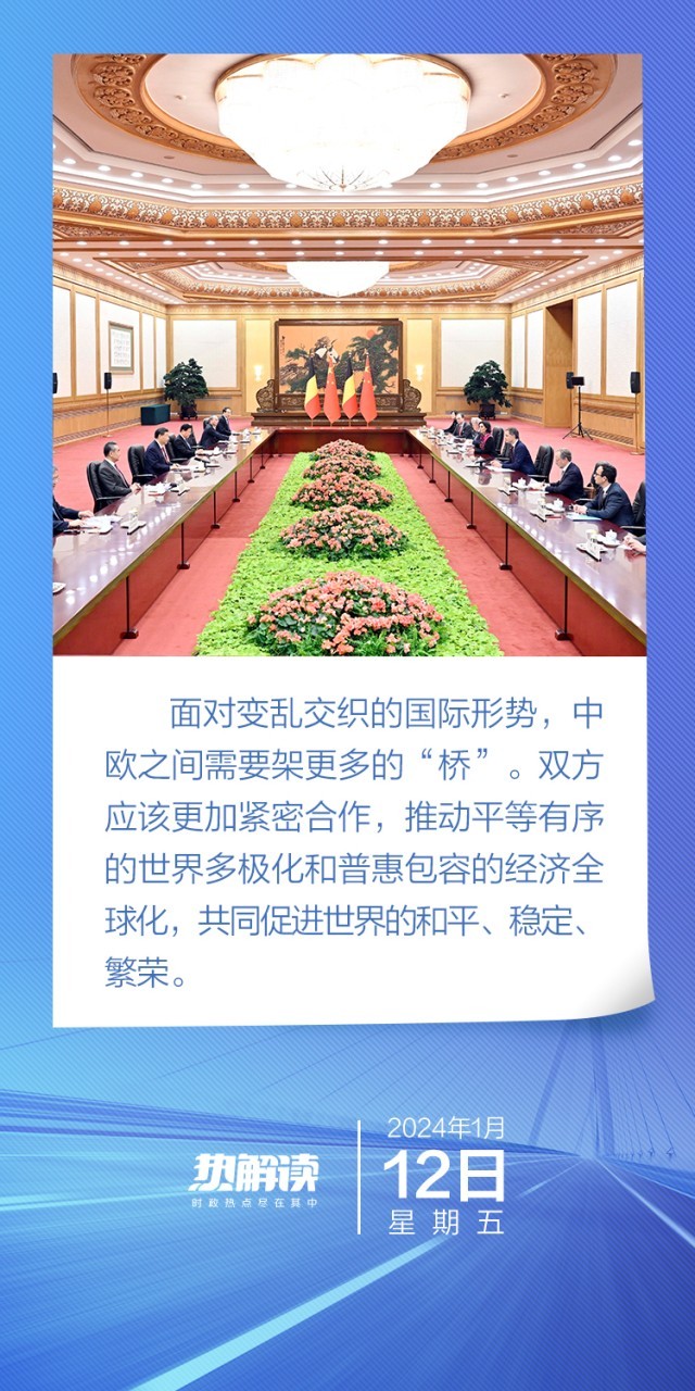 会见中,习近平主席强调,中方愿同欧方一道努力“推动中欧关系在新的一年里稳中有进”,寄望比利时作为欧盟轮值主席国为此发挥积极作用,传递出行稳致远的新期待。对此,德克罗首相予以积极回应,表示世界需要中国和欧洲携手做伙伴,比利时愿为欧中关系发展发挥积极作用。