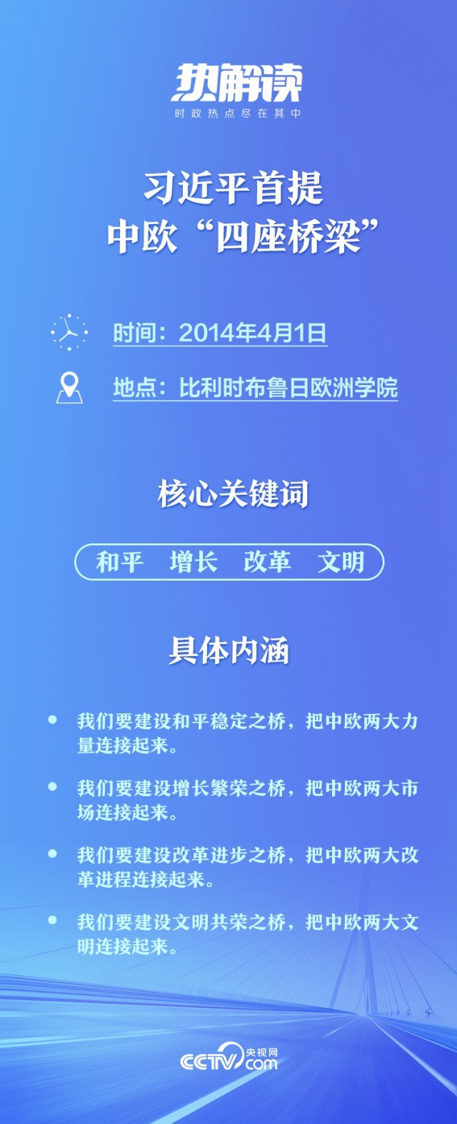 2014年,在位于比利时有着“欧洲政治家的摇篮”之称的布鲁日欧洲学院,习主席发表重要演讲。他借用“布鲁日”在弗拉芒语中“桥”的含义,全面阐述中国对欧政策,首次提出中欧要建设“四座桥梁”主张: