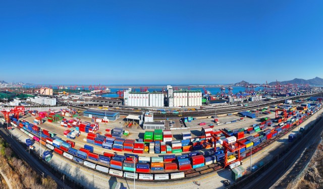 2024年1月10日,江苏省连云港市,大型机械正在装运集装箱货柜。