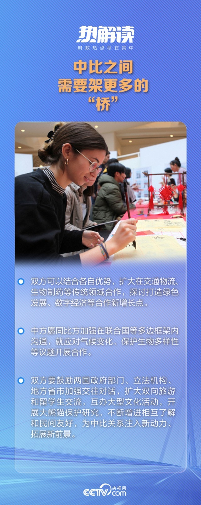刚刚过去的一年,中比经贸合作也不断取得新成果,在农食产品对华出口、民航服务、绿色发展、应对气候变化等议题上共识和合作不断扩大,超过80个中方团组访问比利时。教育、科技、文化交流以及地方省市的友好交往促进了两国民心相通。