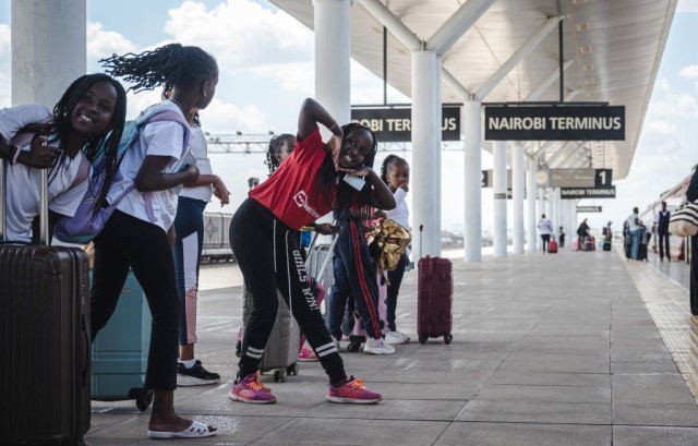 ↑2023年10月6日,儿童在肯尼亚内罗毕的蒙内铁路内罗毕站内等待登车。