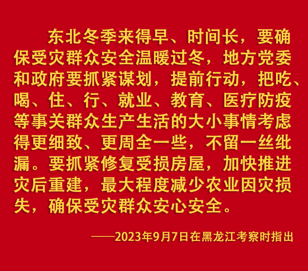 2023年汛期以来,我国华北、东北等地出现极端降雨,引发洪涝和地质灾害。习近平一直牵挂着受灾群众,高度重视防汛抗洪救灾和灾后恢复重建工作,多次作出重要指示批示,要求有关地方和部门全力保障人民群众生命财产安全,尽快恢复灾区正常生产生活秩序。2023年9月上旬,习近平前往黑龙江尚志市看望慰问受灾群众;11月,北方入冬之际,习近平又来到北京、河北受灾较重的相关地区,看望慰问受灾群众,检查指导灾后恢复重建工作。