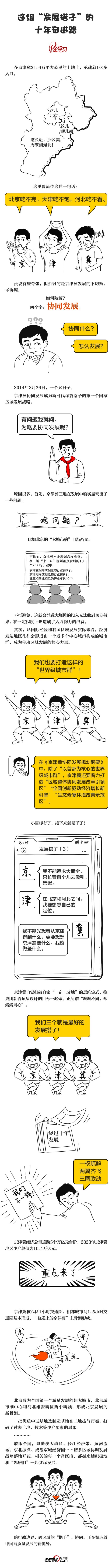 十年来,京津冀三地坚持以新发展理念为引领,立足自身资源禀赋与产业定位,互通有无、转移承接、错位发展,交出一份沉甸甸的成绩单。央视网《天天学习》栏目推出手绘长图,与您一起了解京津冀协同发展的故事。