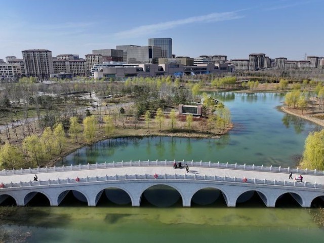 市民在雄安新区容东片区金湖公园内游玩(2024年3月29日摄,无人机照片)。容东片区是雄安新区开发建设的先行区域,担负着承接北京非首都功能疏解和安置回迁群众的重要任务。