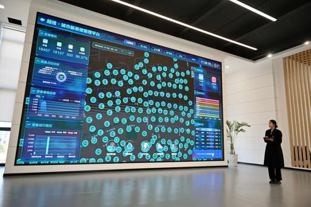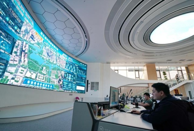 2024年3月29日,雄安新区中国电信智慧城市产业园的工作人员在展示容东片区数字道路运营系统。