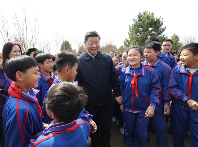 2019年4月8日,习近平等党和国家领导人来到北京市通州区永顺镇参加首都义务植树活动。这是习近平同少先队员在一起。