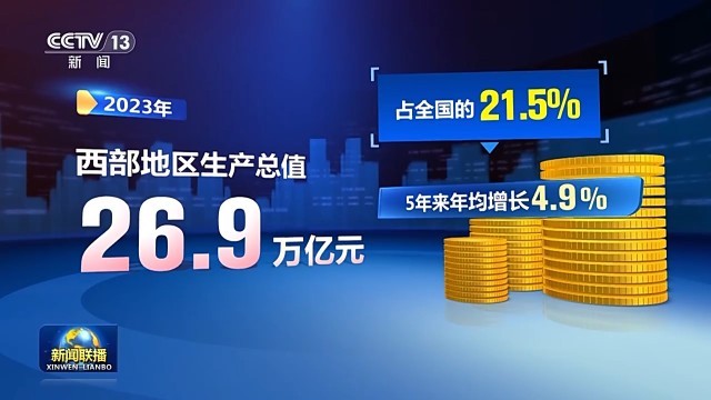 党的十八大以来,习近平总书记考察调研的足迹遍布西部12个省区市,为新时代西部地区发展把脉定向、擘画蓝图。党的二十大报告提出,推动西部大开发形成新格局。沿着总书记指引的方向,西部地区抓重点、补短板、强弱项,经济社会发展取得重大历史性成就。国家发展改革委等部门数据显示,2023年,西部地区生产总值26.9万亿元,占全国的21.5%,5年来年均增长4.9%。