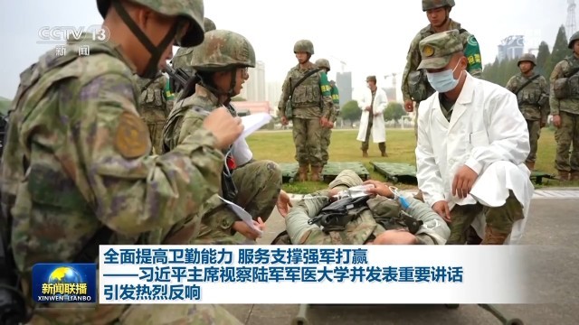 央视网消息(新闻联播):中共中央总书记、国家主席、中央军委主席习近平4月23日到陆军军医大学视察,强调面向战场、面向部队、面向未来,努力建设世界一流军医大学。广大官兵认真学习领会讲话精神,表示要牢记统帅勉励嘱托,聚焦练兵备战,加快创新发展,全面提升卫勤保障能力,为强军打赢提供有力支撑。