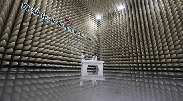 2023年7月7日,在南瑞集团有限公司自动化设备电磁兼容实验室,科研人员在进行辐射发射实验准备工作。