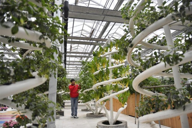 2023年5月13日,在河北曲周县育苗产业园,苗乐园科技小院的学生在查看无土栽培蔬菜。