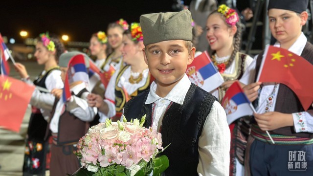 △机场迎接习主席的塞尔维亚少年。(总台央视记者范一鸣拍摄)