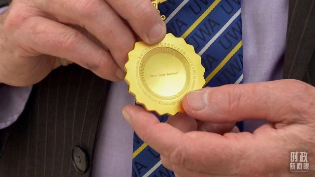 △获奖的外籍科技工作者,奖章的背面刻有获奖者姓名。(总台国广记者李晋、央视记者姚瑶拍摄)