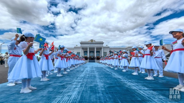从北京到阿斯塔纳,千里之外的中亚上空响起熟悉的东方旋律。在迎宾仪式现场,十余名哈萨克斯坦少年儿童用中文演唱《歌唱祖国》。