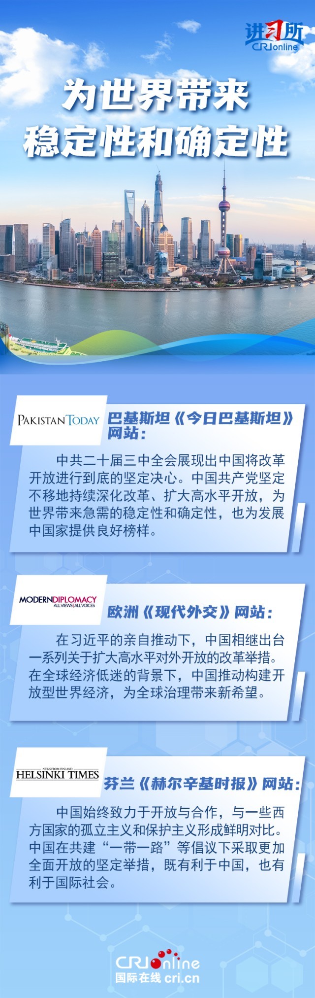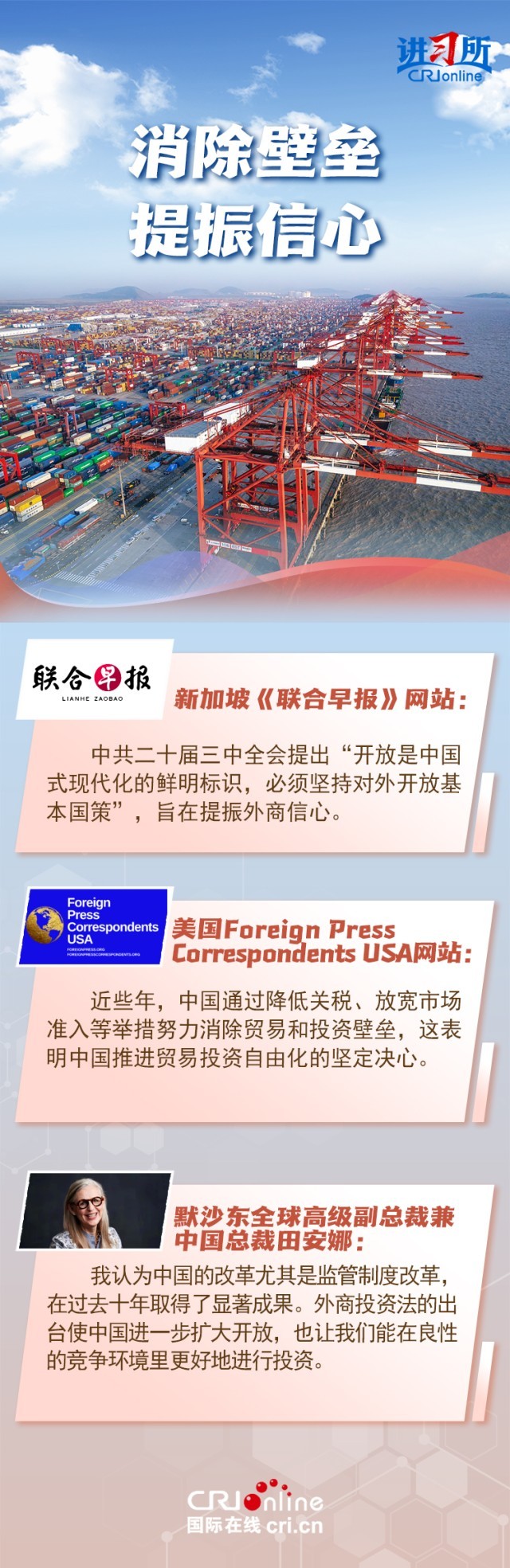 开放是中国式现代化的鲜明标识,也是国际社会持续关注中国全面深化改革的重点所在。“优化营商环境”“放宽市场准入”“144小时过境免签”……中国高水平对外开放,既有高屋建瓴的顶层设计,又有触及民心的灵活实践,给世界带来信心与机遇。