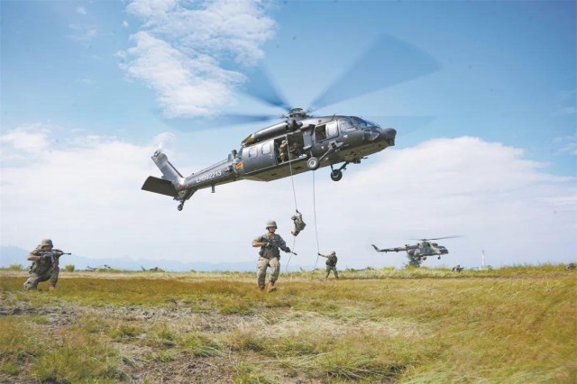 △第72集团军某旅某合成营官兵在陆航部队配合下开展机降训练。