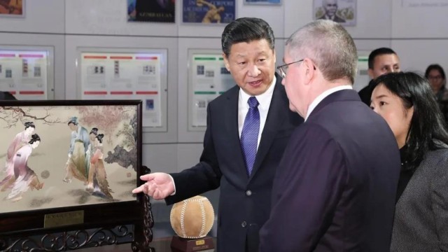 2017年1月,习近平主席在访问瑞士期间,专程来到坐落在洛桑半山腰的国际奥林匹克博物馆。这是中国国家元首首次到访。习近平主席代表中国向国际奥委会赠送了苏绣《仕女蹴鞠图》,并在留言簿上用中文写下:“弘扬奥运精神,促进和平发展”。