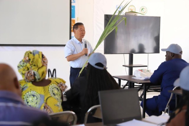 8月4日,在卢旺达南方省胡耶区,林占熺为非洲地区菌草技术培训班授课。新华社发(黄万晴摄)