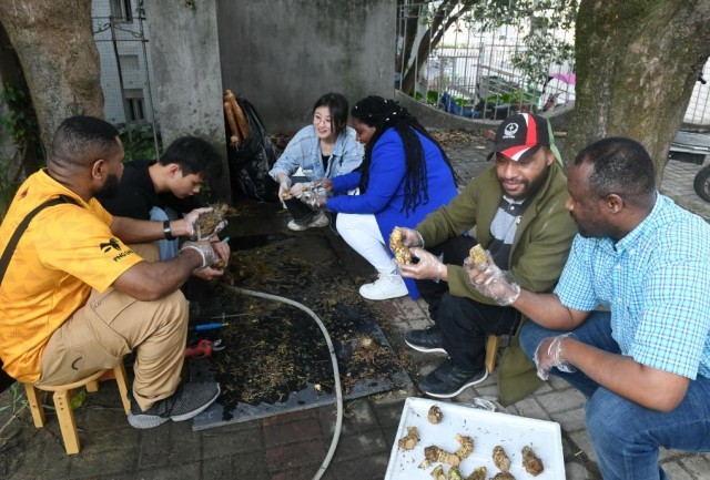 3月28日,在位于福州的福建农林大学,来自卢旺达和巴布亚新几内亚的学生与菌草专业学生交流。新华社记者 林善传 摄