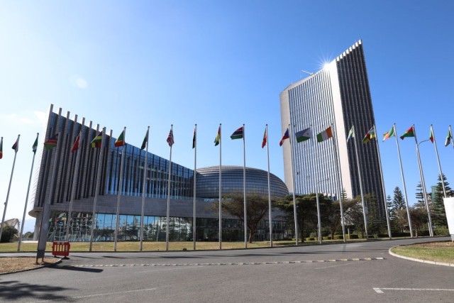这是在埃塞俄比亚首都亚的斯亚贝巴拍摄的非盟总部所在地非盟会议中心(2023年1月8日摄)。非盟会议中心是中国援助非洲标志性项目之一。