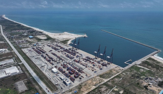 这是在尼日利亚拉各斯州拍摄的莱基港(2024年3月1日摄,无人机照片)。由中国企业承建的莱基港是尼日利亚首个现代化深水港。