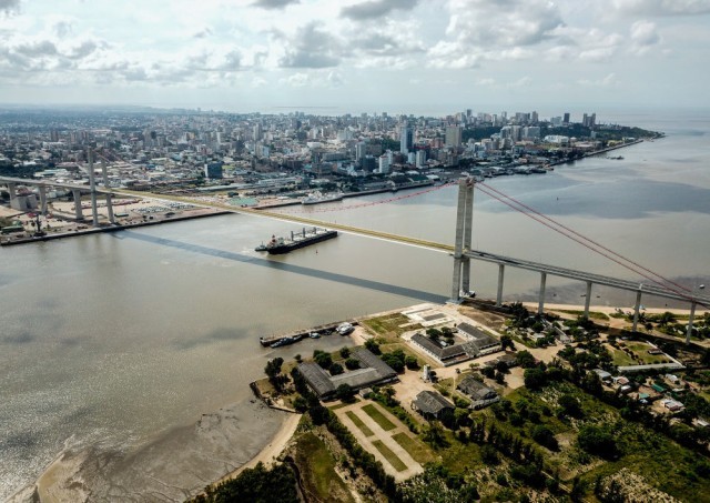 这是在莫桑比克首都马普托拍摄的马普托大桥(2019年4月8日摄,无人机照片)。超大悬索桥马普托大桥飞架天险,横跨马普托湾,该桥极大便利了马普托湾两岸交通,成为莫桑比克纵贯南北、连接南非的交通主干道的重要组成部分。