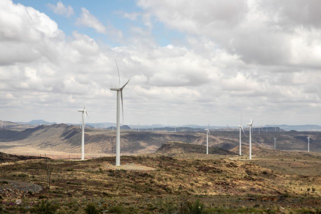 这是在南非北开普省德阿拍摄的中国龙源电力集团南非公司运营的德阿风电项目风机(2021年11月22日摄)。由中国企业建设运营的德阿风电项目自2017年并网发电以来,有效缓解了当地电力供应短缺局面,推动经济发展,改善生态环境。