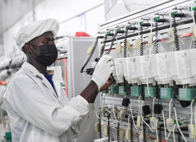2024年4月5日,工人在乌干达姆巴莱中乌姆巴莱工业园的工厂车间内工作。这座乌干达国家级工业园自2018年3月启动以来已吸引40余家企业入驻,为当地创造5000多个就业岗位。