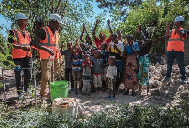 2023年6月13日,在坦桑尼亚姆万扎省米松圭,卫星城供水项目工程师凯尔文(左二)打开水龙头接通水管,赢得当地居民鼓掌欢呼。中国公司参与的卫星城供水项目为当地约15万居民解决了用水难题,居民用水成本大幅下降。