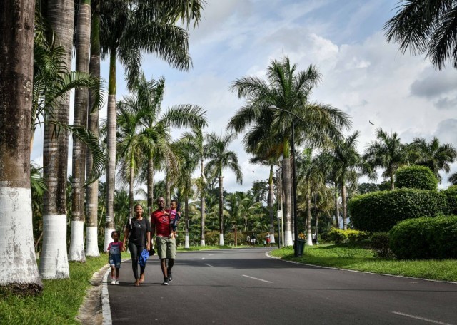 2024年5月19日,人们走在赤道几内亚首都马拉博的马拉博国家公园里。由中国路桥工程有限责任公司承建的马拉博国家公园是赤道几内亚首个大型城市综合性园林,丰富了当地人民的文化娱乐生活。