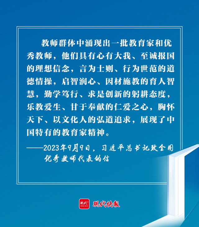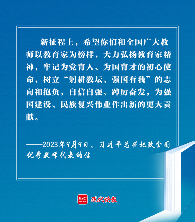 2023年9月9日,习近平总书记在致全国优秀教师代表的信中强调:“新征程上,希望你们和全国广大教师以教育家为榜样,大力弘扬教育家精神,牢记为党育人、为国育才的初心使命,树立‘躬耕教坛、强国有我’的志向和抱负,自信自强、踔厉奋发,为强国建设、民族复兴伟业作出新的更大贡献。”