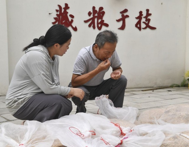2024年9月10日,农业专家、四川农业大学教授马均(右)在永丰村水稻科技小院通过牙咬感受稻谷晾晒程度。