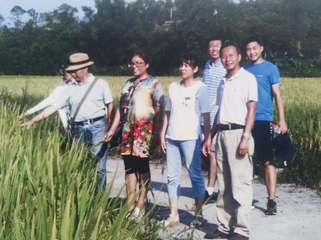 2014年,马均(右二)带领学生在永丰村与当地农技人员交流。
