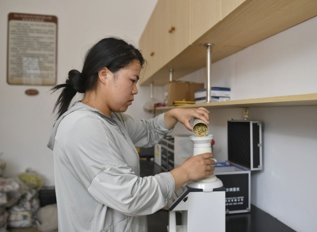 2024年8月22日,在永丰村水稻科技小院,长期驻守在此的四川农业大学学生测量稻谷含水量。