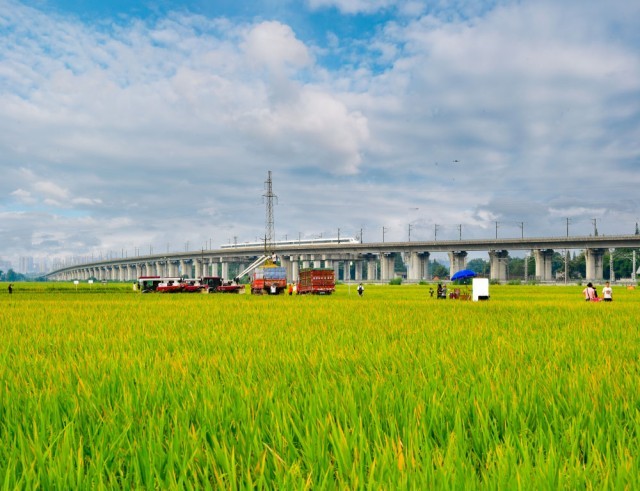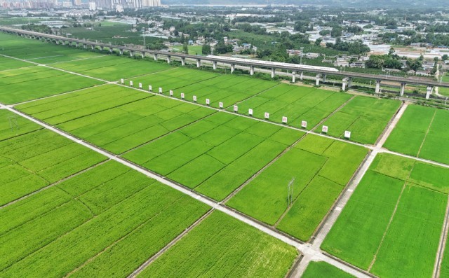 2024年7月26日,一列高铁列车从永丰村高标准农田上方的高架桥上疾驰而过(无人机照片)。过去,永丰村的农田不少是“巴掌田”“鸡爪田”,如今,细碎零散的耕地变成了“田成方、土成型、渠成网、路相通、沟相连”的高标准农田,连片农田实现了全程机械化种植。