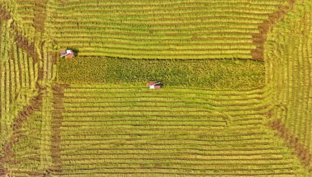 2024年8月22日,收割机在永丰村高标准农田内收割水稻(无人机照片)。团队预计,2024年永丰村高标准农田平均亩产将接近800公斤。