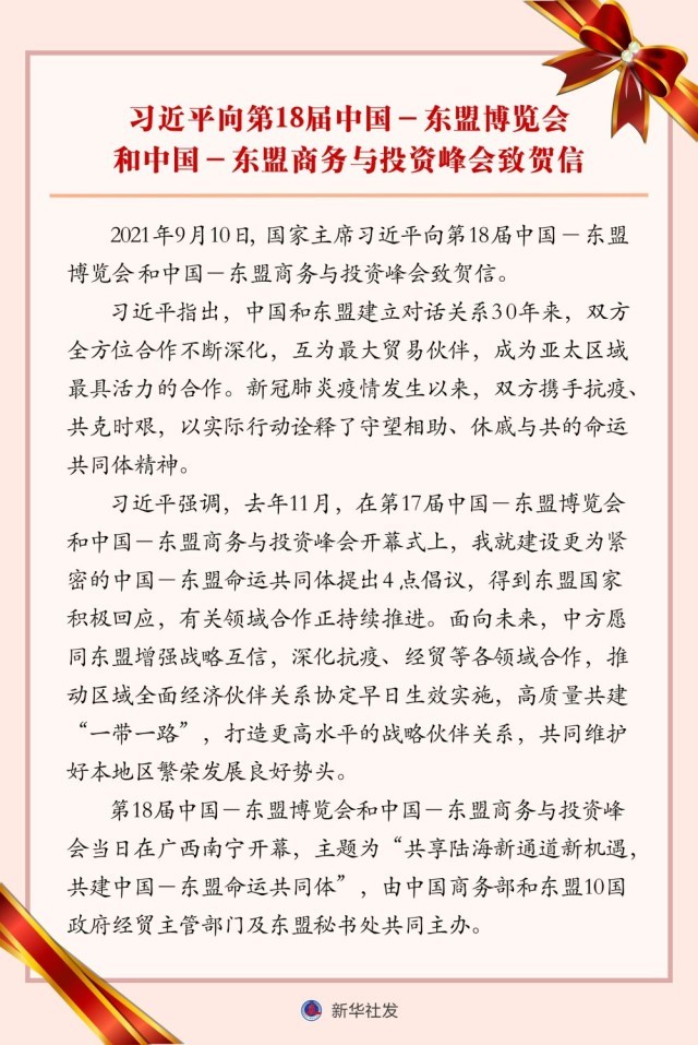2020年和2021年,习近平主席先后为中国—东盟博览会和中国—东盟商务与投资峰会致辞、致贺信,充分体现对这一合作平台的关心和重视。