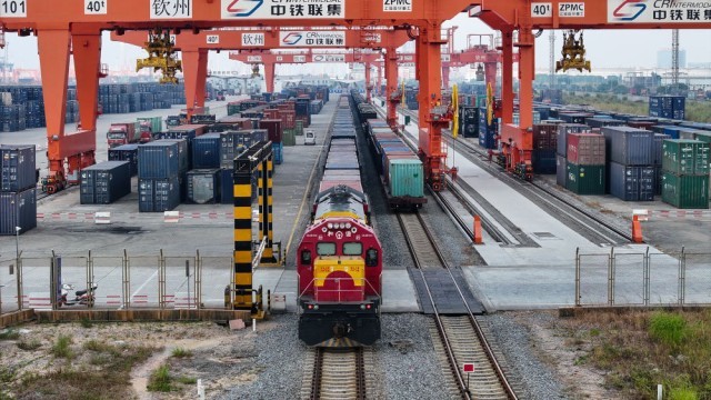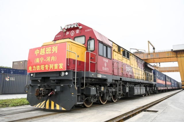 2024年3月8日,在南宁国际铁路港,一列中越班列准备发往越南河内。西部陆海新通道铁海联运班列和中欧班列、中越班列、中老铁路等相互衔接联通,搭建起“多向延伸、海陆互联”的运输服务网络,中国西部地区面向东盟的国际大通道日趋通达。