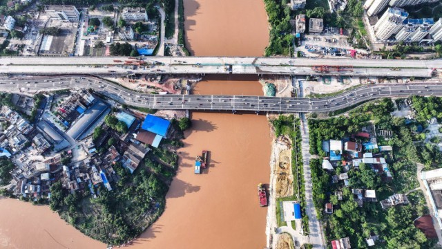 施工队在广西钦州市拆旧桥建新桥,疏浚平陆运河流经钦州市区的航道(2024年5月12日摄,无人机照片)。平陆运河建成后将成为广西及西南地区通往东盟地区运距最短、最便捷的水运出海通道。