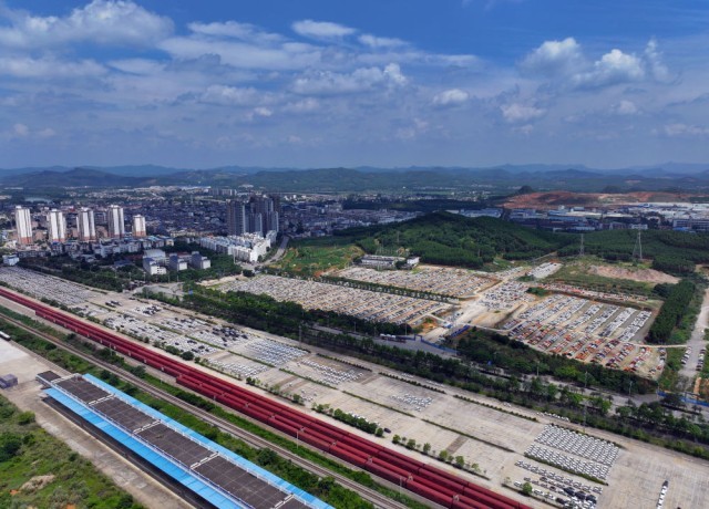 汽车在广西柳州雒容汽车物流基地等待进入铁路货车车厢。部分出口的新能源汽车从这里装车运往各大出海港口(2024年5月24日摄,无人机照片)。