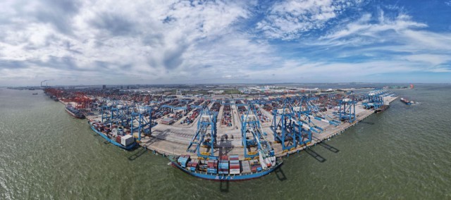 2024年6月13日,途经马来西亚关丹港的“海丰博多”轮在广西钦州港集装箱装卸自动化码头进行装卸作业(无人机全景照片)。