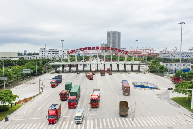 中国(广西)自由贸易试验区钦州港片区(2024年5月20日摄,无人机照片)。聚焦面向东盟、服务陆海新通道、沿边开放三大特色,开展差异化探索和特色制度创新,让中国(广西)自由贸易试验区成为我国面向东盟开放发展的前沿。