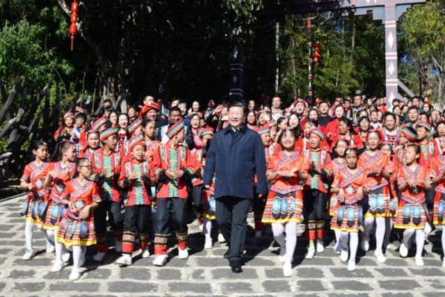 2020年1月19日至21日,习近平总书记来到云南,看望慰问各族干部群众,向全国人民致以新春祝福。这是19日下午,腾冲市清水乡三家村中寨司莫拉佤族村的乡亲们唱着《阿佤人民唱新歌》,簇拥着习近平总书记走出村口。新华社记者 谢环驰 摄