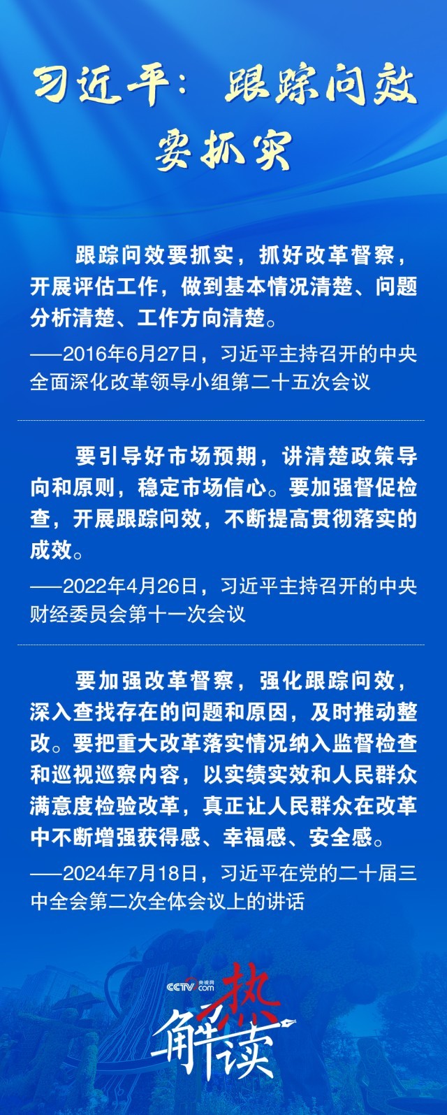 今年7月,在党的二十届三中全会第二次全体会议上,习近平总书记进一步提出,要强化跟踪问效,深入查找存在的问题和原因,及时推动整改。