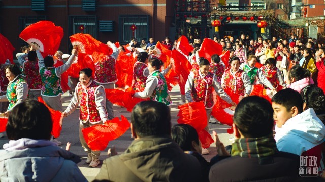△长安小区文化广场上,居民们扭起欢快的秧歌。(总台央视记者彭汉明拍摄)