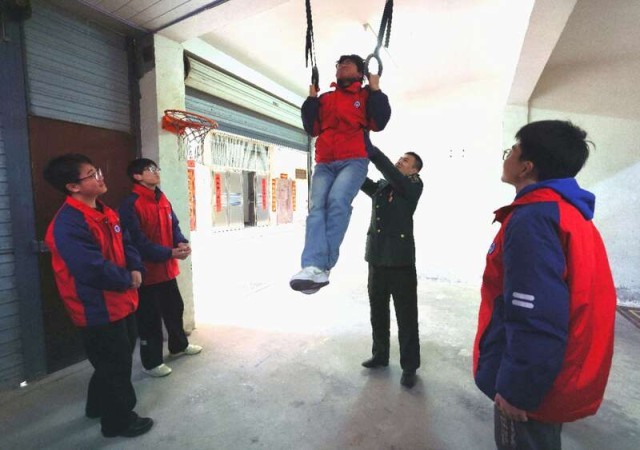 叶大山(右二)帮助一名学弟做拉吊环的动作。中青报·中青网记者 王海涵/摄