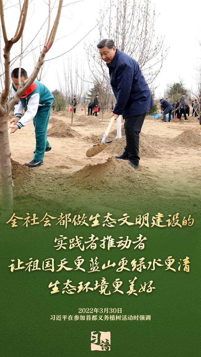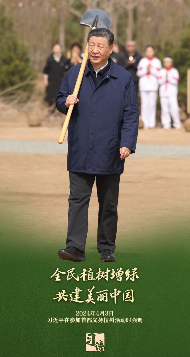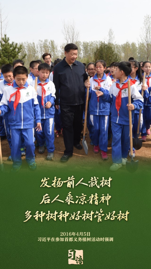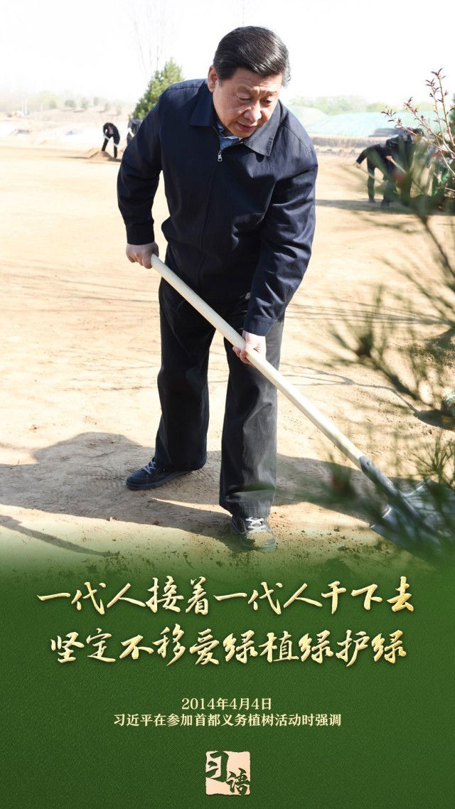 “植树造林是一件很有意义的事情,是一项功在当代、利在千秋的崇高事业,要一以贯之、持续做下去。”自2013年以来的13个春天里,无论晴雨,习近平总书记都会拿起铁锹,与干部群众一起参加首都义务植树活动。铲土造坑、培土围堰、提水浇灌,总书记身体力行种下绿色的希望,对扩绿兴绿护绿、建设美丽中国提出明确要求。一起学习。